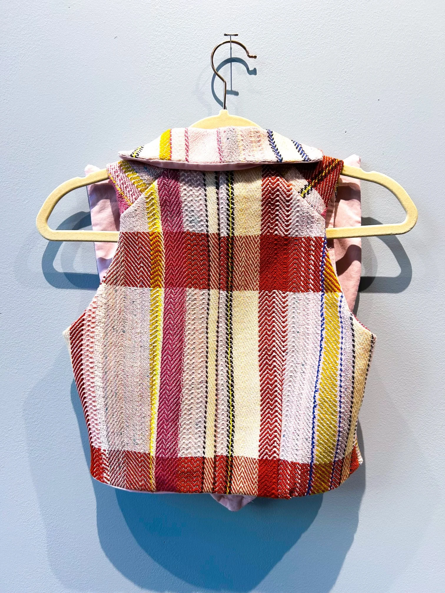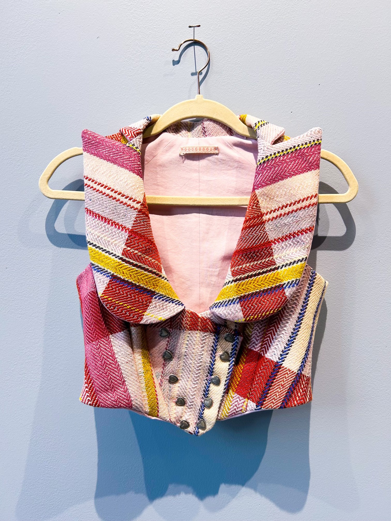 After weaving a 3-yard twill panel, I constructed a lined waistcoat. With the late British Designer Vivian Westwood in mind, this structured waistcoat with statement lapels became the perfect home for my woven striped yardage.